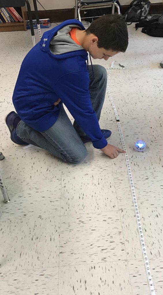 The project uses a motion detector to measure and graph motion as velocity and acceleration. It allows students to relate algebraic equations, and they can share the experience with their parents. A robotic ball paired with a tablet illustrates math concepts like velocity, acceleration and coefficients of friction.